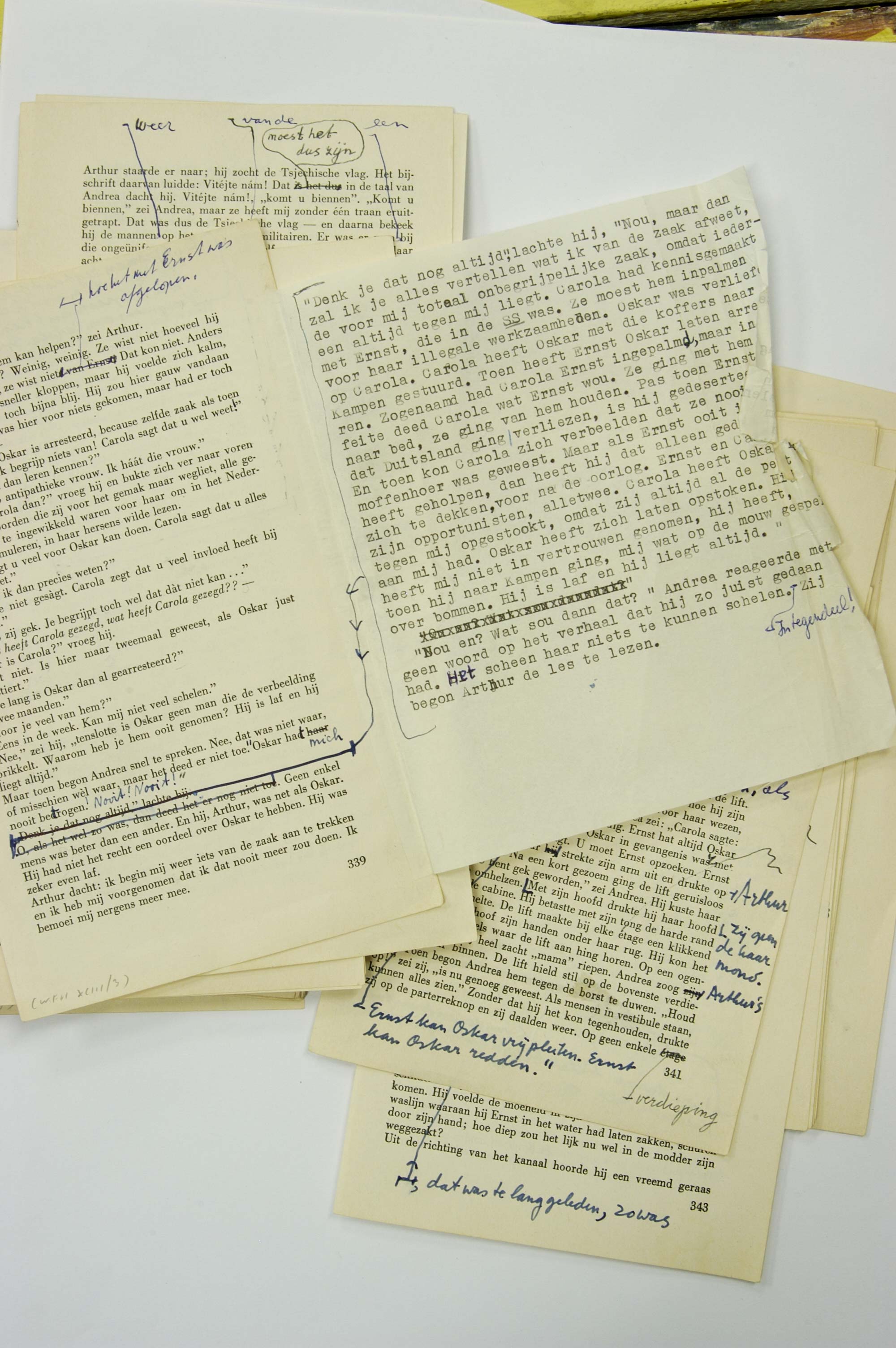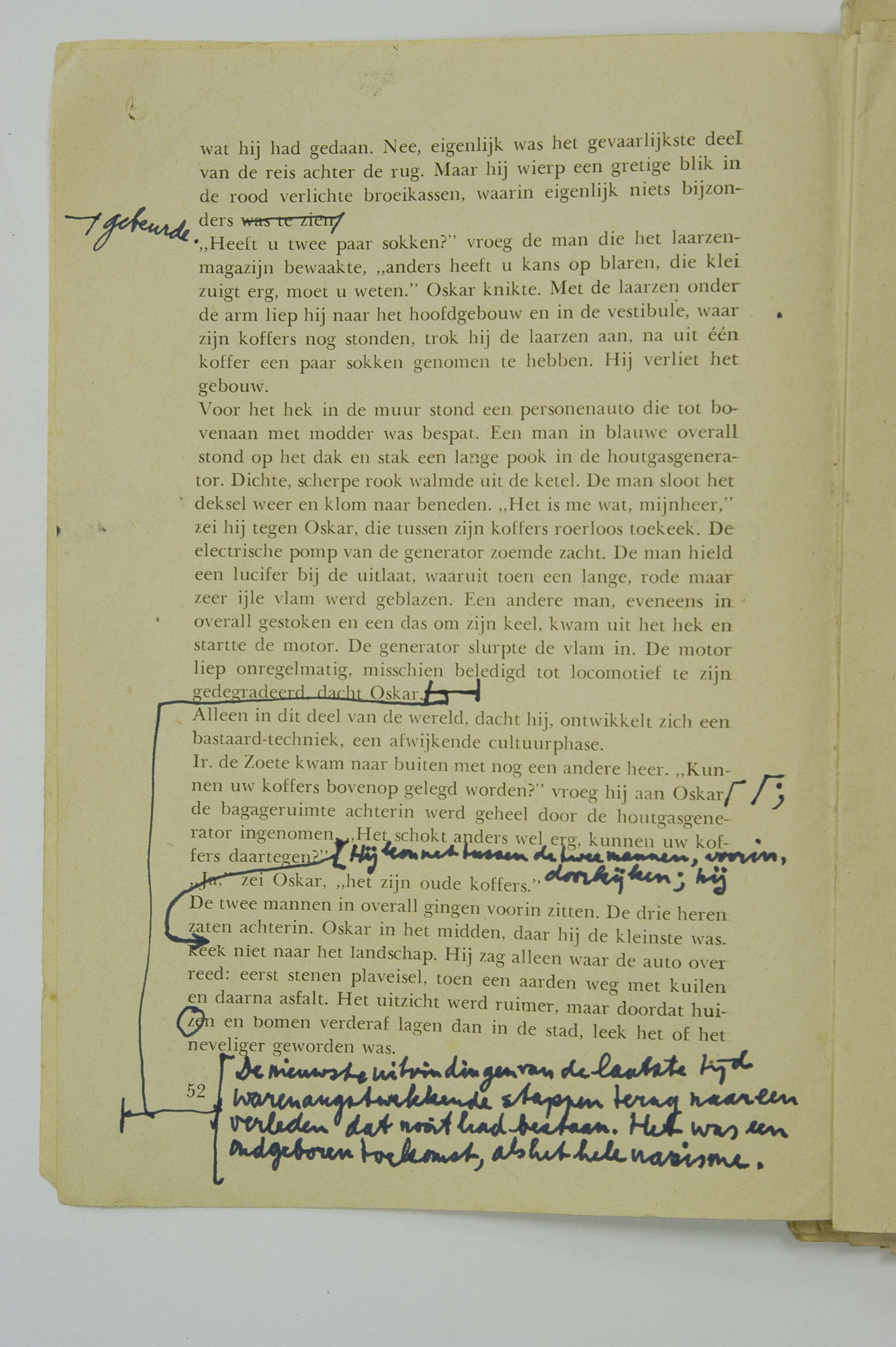 Enkele andere voorbeelden van inhoudelijke veranderingen die zowel in het correctie-exemplaar als in het latere kopijexemplaar voorkomen lijken het doel te hebben de machteloosheid van de personages ten opzichte van de gebeurtenissen in de hen omringende wereld nog sterker aan te geven. Zo wordt in het eerste hoofdstuk herhaaldelijk het onmachtig handelen van Oskar becommentarieerd via toegevoegde zinnetjes als ‘De papieren in dit sigarenkistje hadden niet de geringste waarde. De twee andere copieën had hij nodig!’ en ‘De man die zonder kaartje het station is uitgelopen. De man die twee identiteiten heeft’. Een aanzienlijke toevoeging in het voorlaatste hoofdstuk, waar Arthur tegenover Andrea probeert het handelen van Oskar, Ernst en Carola, de voor hem ‘totaal onbegrijpelijke zaak’, te reconstrueren, valt binnen diezelfde context te lezen.[11]