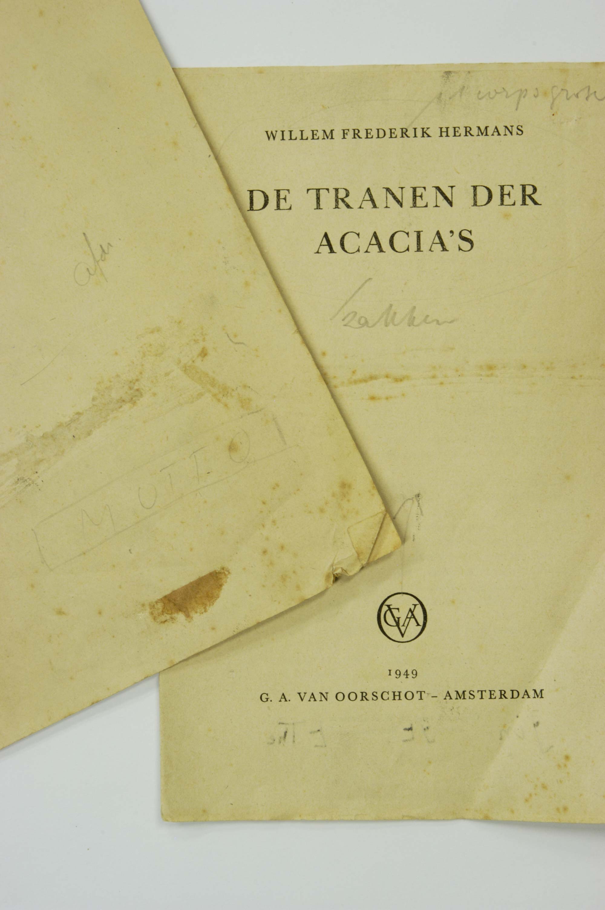 Een uit elkaar gehaald exemplaar van de eerste druk diende als kopij voor de tweede druk van De tranen der acacia’s en bevat correcties in verschillende schrijfstoffen afkomstig van Hermans (wijzigingen in blauwe vulpeninkt en gedeeltelijk in potlood) en derden. Waarschijnlijk gaat het hier om een door een redacteur of corrector voorgecorrigeerd exemplaar, waarin Hermans vervolgens zijn verbeteringen aanbracht: bij een aantal onduidelijke of ongelukkig geformuleerde passages staan vraagtekens in de marge, waar Hermans bij zijn correctie op reageerde, hoewel hij sommige fragmenten (waaronder een vraagteken bij ‘witte schimmels’ in het negentiende hoofdstuk) ongemoeid liet.
