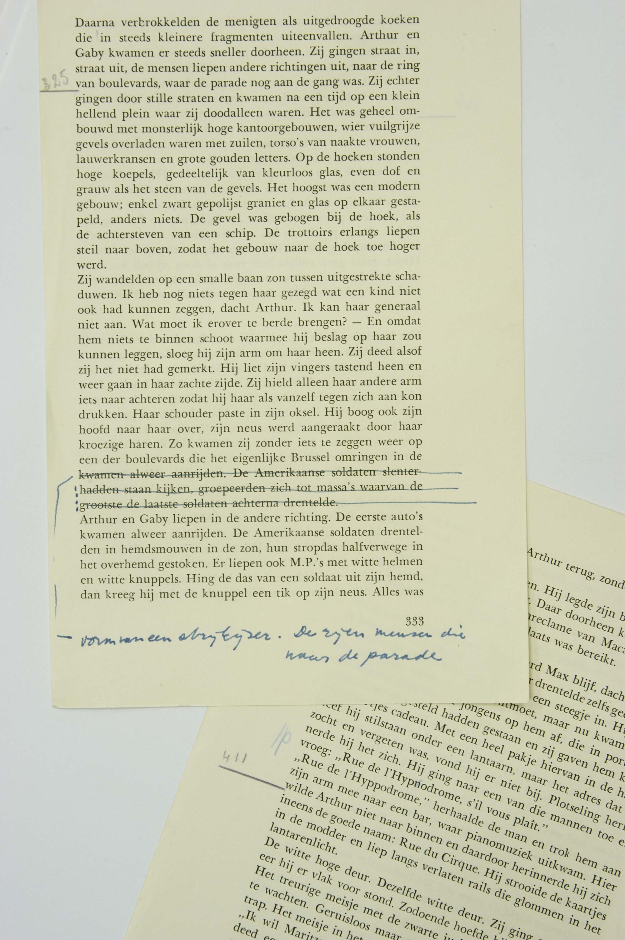 WFH (Drukproeven) De tranen der acacia’s [IV] Van het laatste katern van de eerste drukproef (pagina’s 417 tot en met 428) bevindt zich nog een extra set in het Hermans-archief. Ook dit fragment heeft correcties (in blauwe inkt en in potlood) van Hermans, die maar gedeeltelijk overeenkomen met de in de andere gecorrigeerde proef (P2) aangebrachte wijzigingen. De correcties betreffen zetfouten en kleine, meest stilistische herzieningen. De verbeteringen in dit fragment van de proef zijn niet verwerkt in de revisieproef (P4); het fragment speelde in een later moment wel een rol bij het herzien van de revisieproeven, omdat een aantal van de correcties verwerkt is in de eerste druk van De tranen der acacia’s.