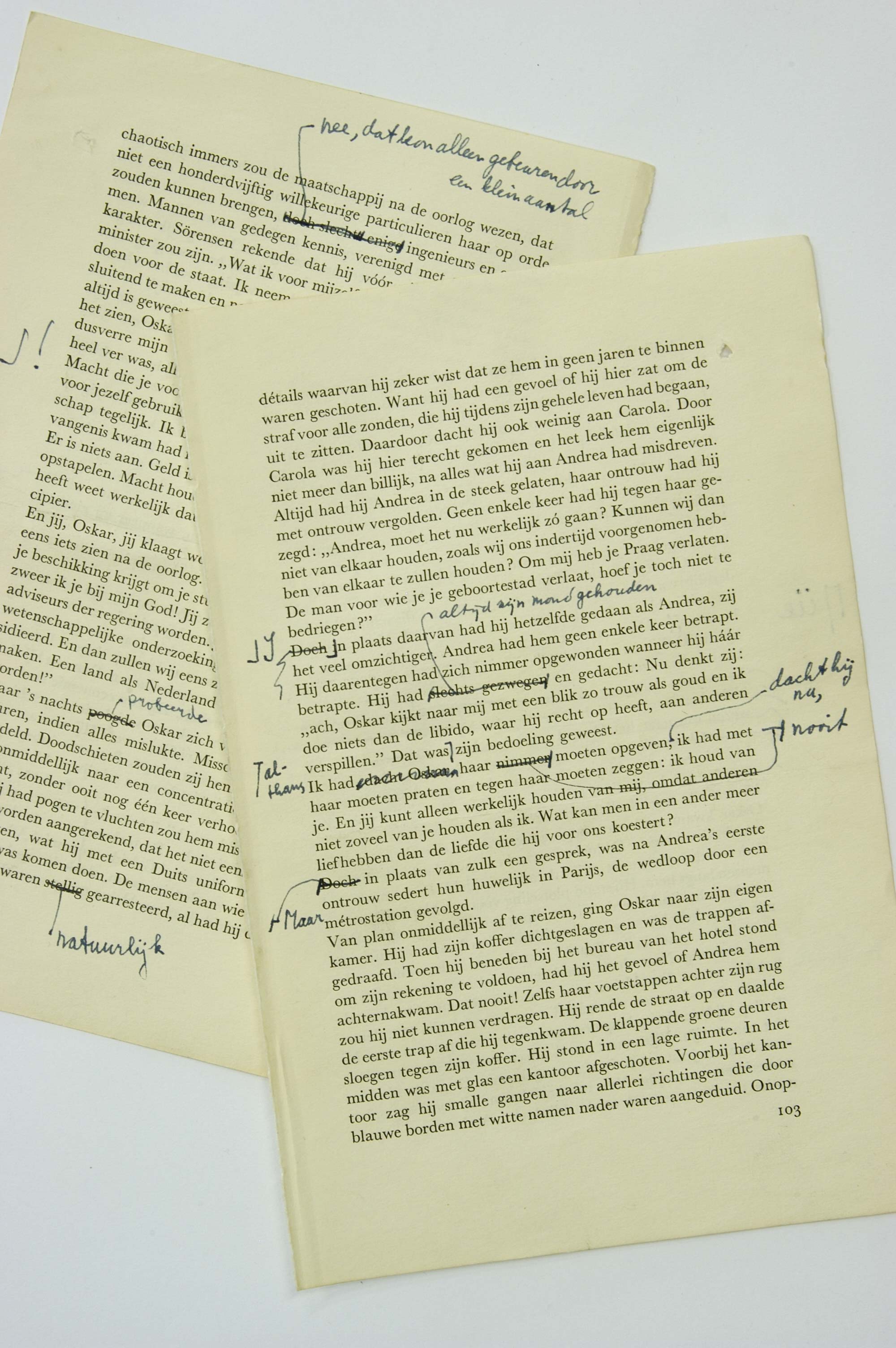 Van de gecorrigeerde revisieproef is in het Hermans-archief alleen het eerste katern teruggevonden; het buitenste vel daarvan (pagina’s 1-2 en 15-16) bevindt zich op een andere plaats dan de rest van het katern (pagina’s 3 tot en met 14), maar vormt daarmee wel een geheel, wat onder andere blijkt uit aanwezige potloodaantekeningen (mogelijk van de zetter) en de op alle pagina’s door de zetter aangebrachte inkepingen. Het eerste vel bevat geen correcties, wel is er ruimte gereserveerd voor het motto, dat dus pas in een laat stadium aan de tekst is toegevoegd. De overige pagina’s bevatten, in donkerblauwe vulpeninkt, enkele correcties van opmaak- en zetfouten; Hermans haalde daarnaast incidenteel aan- en afhalingen rondom gedachteweergaven weg.