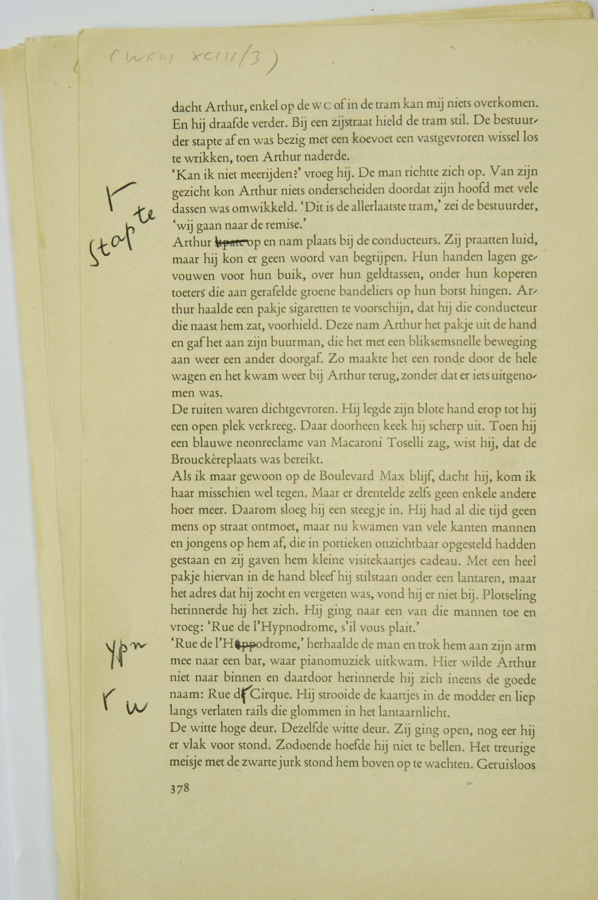 Enkele details vallen op. De volgorde van twee aan het einde van het derde hoofdstuk toegevoegde zinnen is omgedraaid ten opzichte van de kopij. In het zesde hoofdstuk verbeterde de redacteur ‘soecialisten’ naar ‘socialisten’, waar dat ‘specialisten’ had moeten zijn.[13] Het verschil in schrijfwijze bij ‘Rue de l’Hypnodrome’ en ‘Rue de l’Hyppodrome’ in het afsluitende hoofdstuk wordt teniet gedaan: de redacteur verbeterde ‘l’Hyppodrome’ naar ‘l’Hypnodrome’. Naast de correcties in rode inkt van de redacteur zijn er enkele kleine inhoudelijke correcties in zwarte inkt die Hermans bij het doornemen van de eerste proef aanbracht.