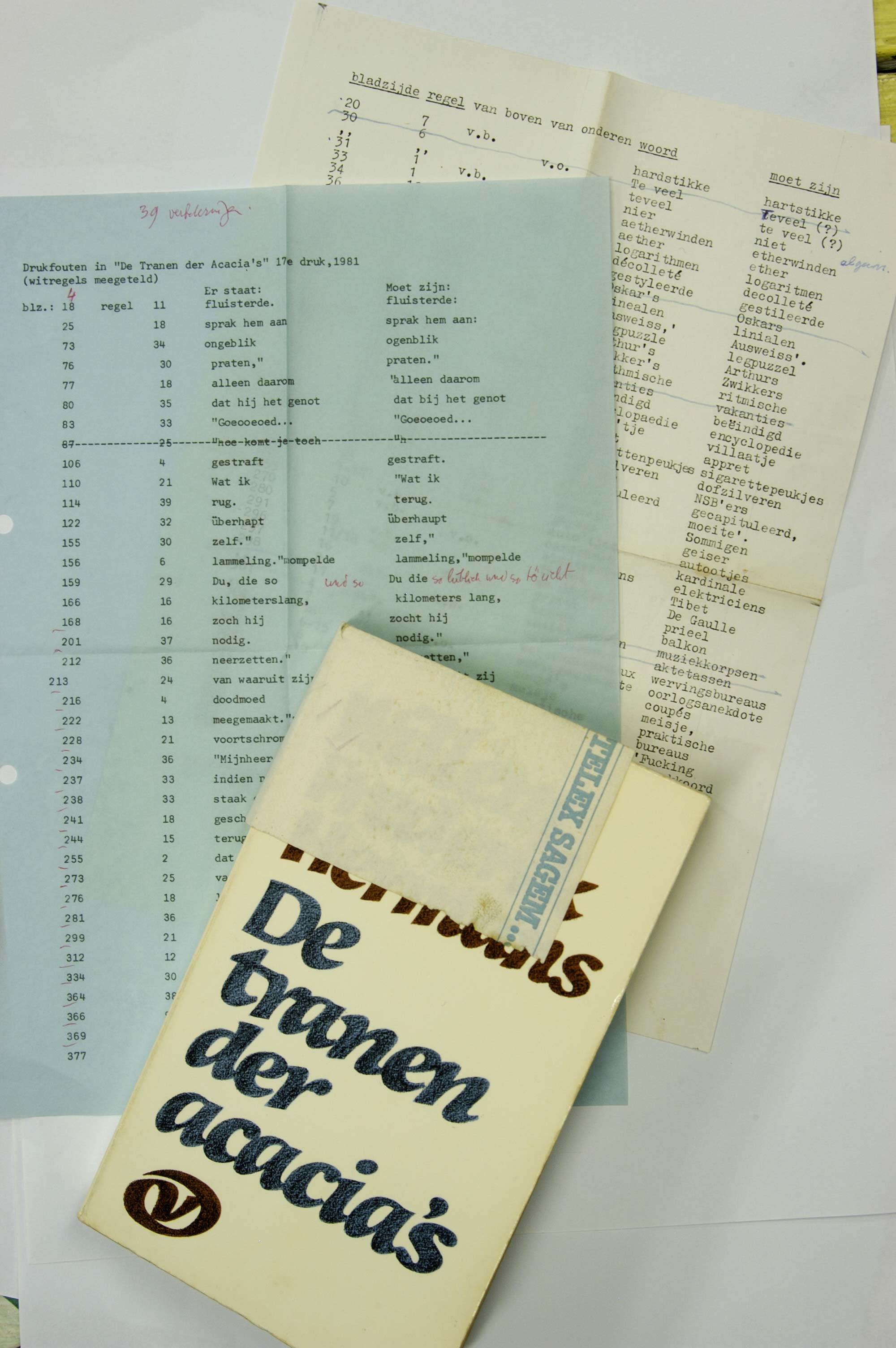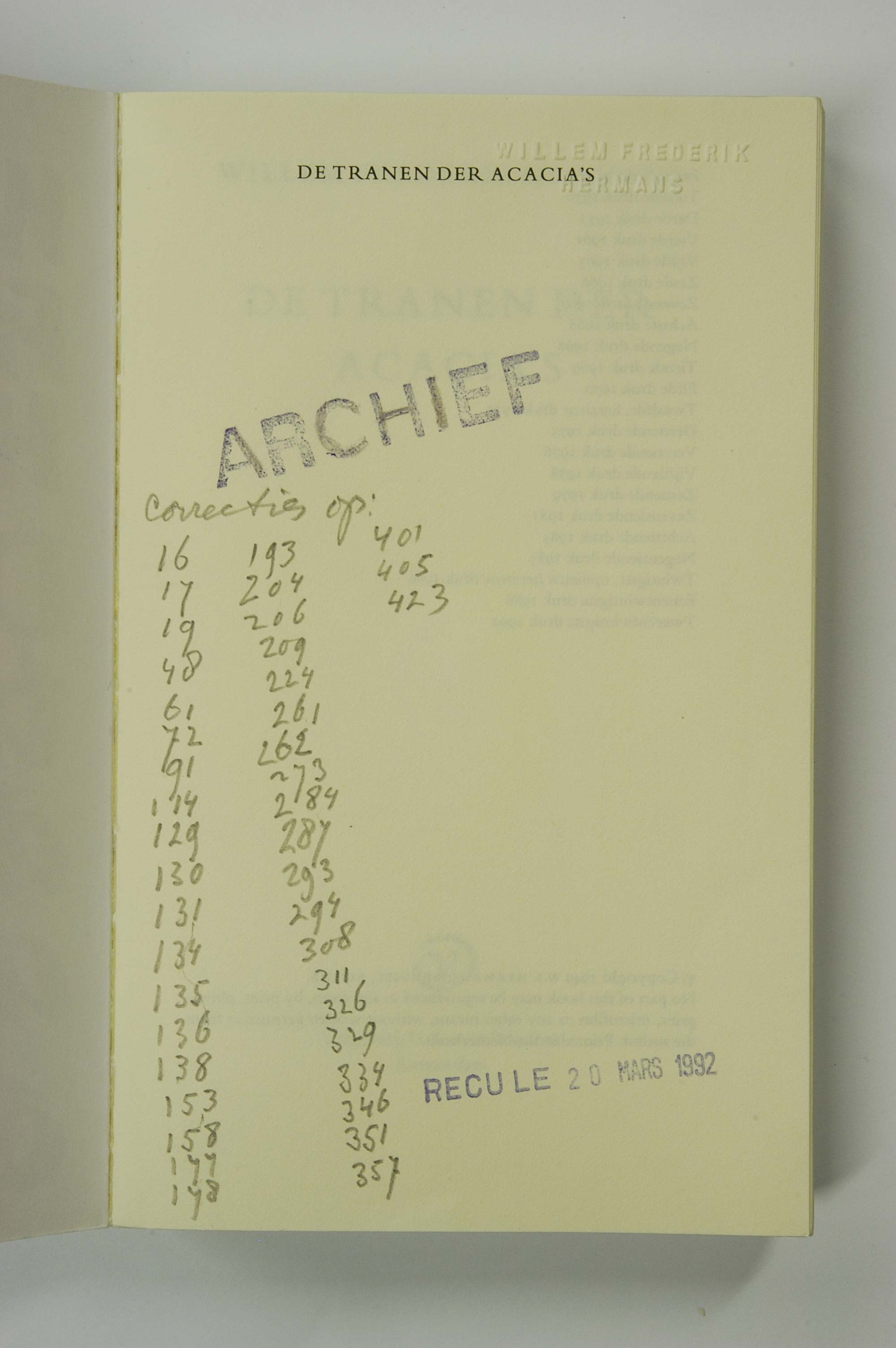 Dit correctie-exemplaar uit het archief van Uitgeverij Van Oorschot bevat een, niet door Hermans opgesteld, handgeschreven erratavelletje met enkele correcties voor de zestiende druk van De tranen der acacia’s. Het lijstje met verbeteringen komt grotendeels overeen met de voorstellen tot correctie die de uitgever al per brief aan Hermans deed.[15] Het correctie-exemplaar bevat enkele kleine aanvullende wijzigingen van Hermans.