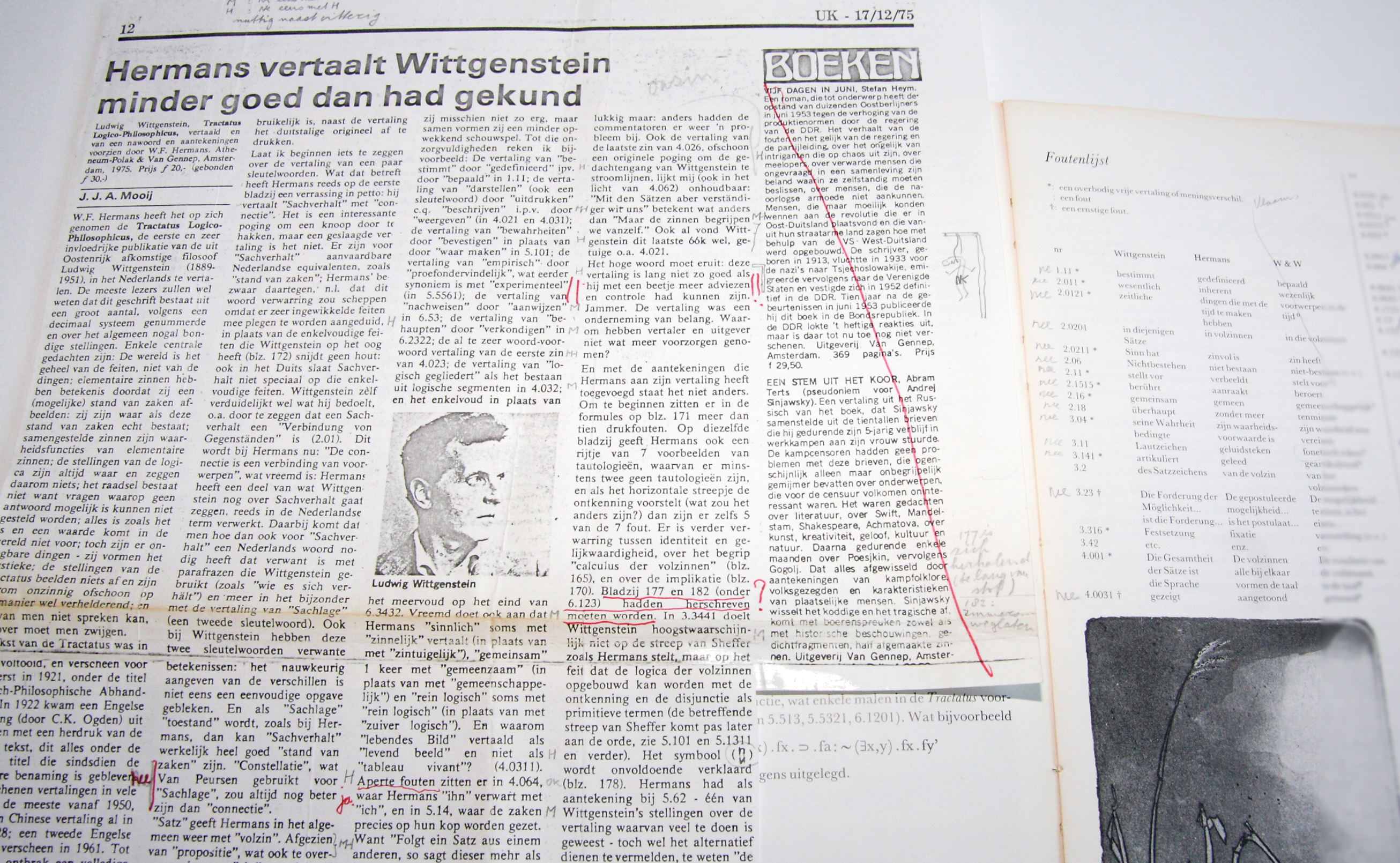 In zijn exemplaar van De Revisor plaatste Hermans aantekeningen in de marges van het artikel, en ook de foutenlijst voorzag hij van uitgebreid commentaar. Af en toe schreef hij ‘ja’ bij een alternatieve vertaling van De Ruiter en Stange, maar meestal noteerde hij afkeurend ‘nee’, een enkele maal ook ‘ha ha’ of (bij een voorgestelde correctie op zijn vertaling in stelling 4.1271) nog explicieter ‘nee!’ en ‘zeer fout van deze jongens’.[1]